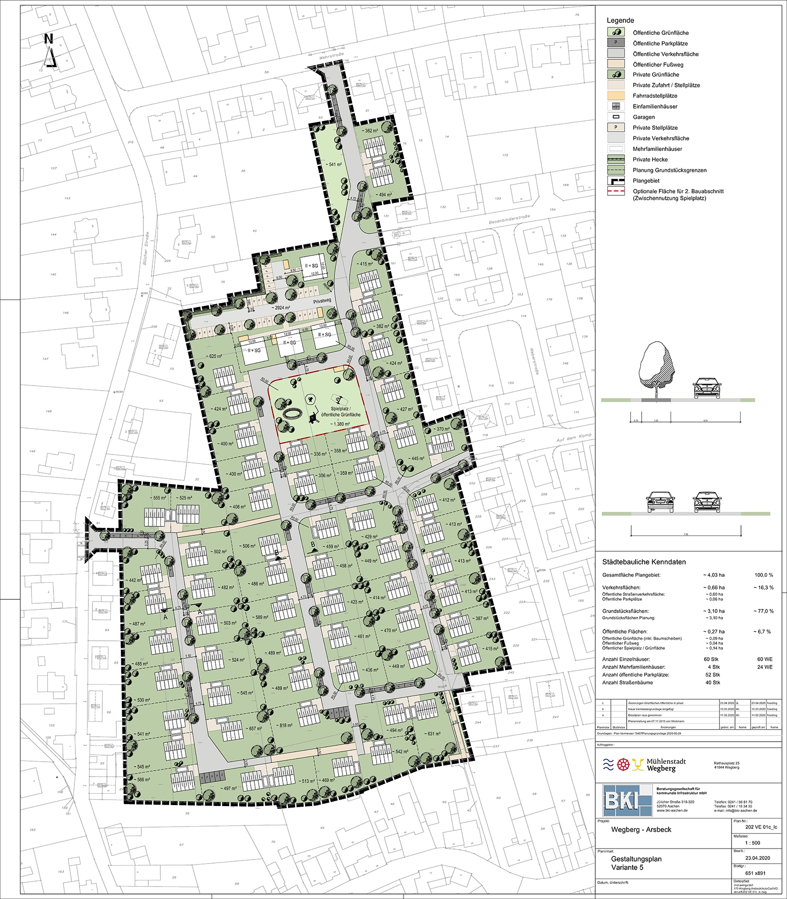 Auf 31.000 m² entstehen hier rund 60 Grundstücke für Ein- und Zweifamilienhäuser. Die einzelnen Grundstücksgrößen variieren zwischen 365 und 818 m². Darüber hinaus werden vier Mehrfamilienhäuser in diesem Gebiet entstehen.